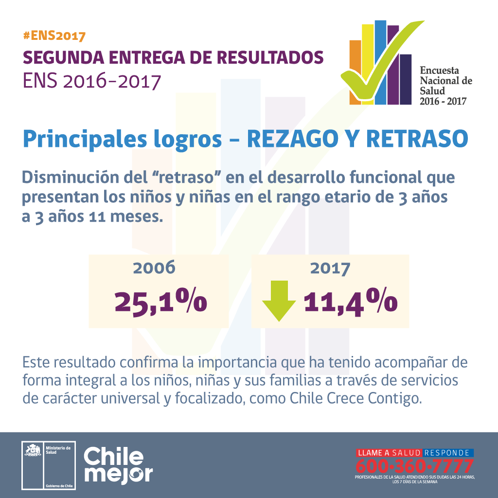 Entre los avances, las autoridades destacaron los indicadores reflejados en materia de desarrollo funcional infantil. La ENS mostró una disminución estadísticamente significativa en el retraso en el desarrollo funcional que presentan los niños/as en el rango etario de 3 a 3 años 11 meses, entre los años 2006 y 2017, pasando de un 25,1% (en 2006) a un 11,4% (en 2017).
