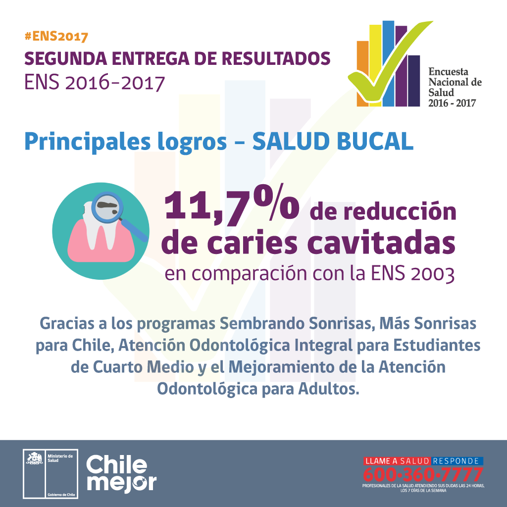 Y respecto de la salud bucal de las mujeres, que ha sido una prioridad sanitaria, es posible constatar que hoy presentan una dentición más funcional y una disminución progresiva de las caries cavitadas respecto de la ENS anterior.